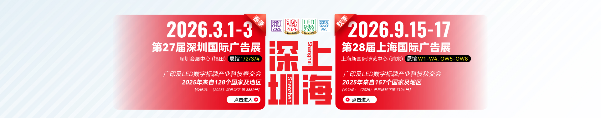 2026年,SIGN CHINA 将全新开启 “春秋双展” 布局 ——3 月相约深圳、9 月聚首上海,为广告科技产业打造兼具规模与实效的春秋双季 “交易会”。展会期间,SIGN CHINA 将与国际 LED 显示屏及照明展(LED CHINA)、国际智慧显示及数字标牌展(DS CHINA)、国际喷绘图文及数码印花展(DP CHINA)实现 “四展联动、资源融合”,构建覆盖全产业链的一站式采购平台,助力业界精准对接优质资源,高效开拓市场新增量!