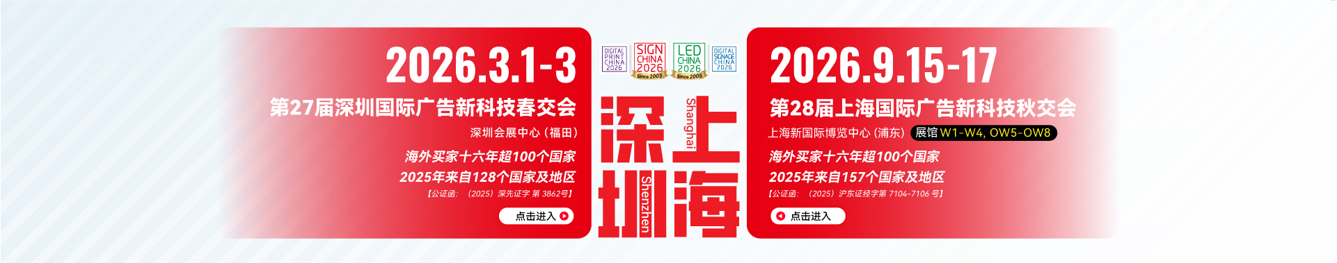 2026 年,SIGN CHINA 将延续 “春秋双展” 战略布局 ——3月于深圳会展中心(福田)启幕,9 月在上海新国际博览中心(浦东)开展,打造广告科技产业极具规模与实效的春秋双季 “交易会”。 SIGN CHINA 同期举办国际 LED 显示屏及照明展(LED CHINA)、国际智慧显示及数字标牌展(DS CHINA)、国际喷绘图文及数码印花展(DP CHINA)实现 “四展联动、资源融合”,构建覆盖全产业链的一站式采购平台,助力业界精准对接优质资源,高效开拓市场新增量!